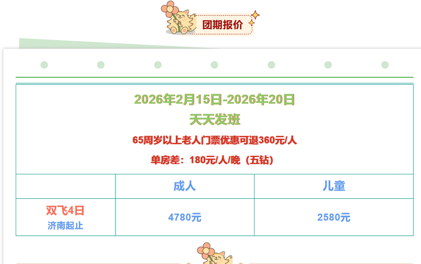 1、网上下单及报名,支持在线支付,支付前请与工作人员确认线路价格及位子情况方可支付否则支付无效,工作人员会在24小时内处理您的订单并与您电话沟通。 2、电话预约,电话0531-88551806 88558582 24小时服务电话15668317631随时为您服务,电话预留位成功后方可网上在线支付。 3、直接来我社报名,我们的地址:济南市和平路47号诚基中心19号楼103室,工作时间:周一至周五09:00-17:00,周末请先电话预约。 4、网上报价仅供参考,所有线路价格均以实际出团日期为准,预定前请先电话与客服人员询问具体价格! |