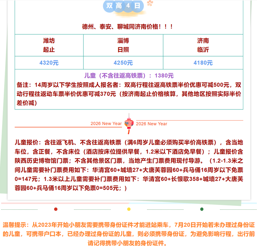 行程标准 1景区:景点首道门票(不含景区小交通) 2导服:优秀导游服务,报价已含当地导游服务费 3交通:往返飞机/高铁/动车,当地空调旅游大巴 ,每人一个正座(景区内电瓶车费用需自理) 4用餐:酒店含早,2特色正餐,早餐为酒店赠送,按床位提供,不用早餐,无法退早餐费。 5.住宿:全程入住携程五钻酒店:若无三人间或者单人产生单房差,则需当地现补房差 6特色安排:行程中安排的特色或赠送项目,游客如果自愿放弃,或因人力不可抗力的情况未能安排,我社不予退费! 7儿童报价:含往返飞机、不含往返高铁票(满6周岁儿童必须购买半价高铁票),含当地车位,含正餐,不含床位(酒店按床位提供早餐,1.2米以下酒店免早餐);儿童报价含陕西历史博物馆门票;不含其他景区门票,当地产生门票费用现付导游。(1.2-1.3米之间儿童需要补门票费用如下:华清宫60+城墙27+大唐芙蓉园60+兵马俑16周岁以下免票0=147元;1.3米以上儿童需要补门票费用如下:华清宫60+长恨歌358+城墙27+大唐芙蓉园60+兵马俑16周岁以下免票0=505元;) 购物自费 1.旅行社在产品线路中不安排购物店,但行程中途经的很多场所(如:景区、酒店、餐厅、机场、火车站等)内部都设有购物性的商店,此类均不属于旅行社安排,我社对其商品质量无法担保,请游客慎重选择! 2.自费项目:全程无自费景点和演绎项目推荐;景区小交通不属于导游推荐自费项目,客人可根据个人体力自行选择! 预定须知