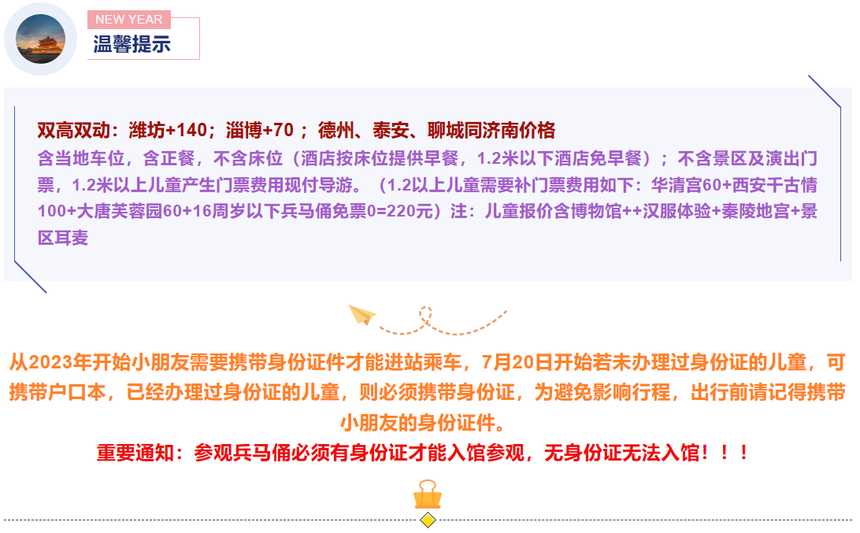 ![]() 行 程 特 色 2026 New Year 品质纯玩 山东独立成团,品质纯玩无购物,无任何强制自费! 世遗长安 秦始皇兵马俑博物馆、陕西历史博物馆,两大博物馆探秘千年历史! 精选住宿 全程入住国际品牌---希尔顿欢朋酒店,舒适睡眠,轻松出行! 风味美食 特色餐:关中坐席菜(餐标60)、同盛祥泡馍(餐标80)! 特色安排 1、被称为古都明珠,华夏宝库的瑰丽殿堂的【陕西历史博物馆】! 2、价值298元的史诗巨献表演【西安千古情】,沉浸式地感受一次穿越之旅! 3、新春大潮会---【大唐芙蓉园新春灯会】,开启新春长安游,花样精彩陪你大饱眼福! 4、游览【秦陵地宫】,使游客置身其中,身临其境,亲眼目睹秦陵“千古之迷”! 5、身着心仪的【汉服唐装】,改扮成盛唐才子佳人,去遇见千百年前的趣事和美好! 6、夜游【大唐不夜城】,灯火璀璨,光影中的仿古建筑流光溢彩,打卡网红盛唐密盒! 精选景点 西安、兵马俑、华清宫、西安千古情、秦陵地宫、钟鼓楼广场、回民小吃街、陕西历史博物馆·秦汉馆、大唐芙蓉园新春灯会、大雁塔广场、大唐不夜城、汉服体验 费用说明